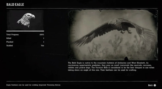 Not withstanding the fact that there is no legendary version of the Bald Eagle to hunt in Red Dead Redemption 2, killing one successfully yields a lot of material worth. The carcass can be sold for anywhere between one and four dollars depending on its quality as well as other crafting purposes for the feathers. Weapons like improved throwing knives and tomahawks require eagle feathers, which are also needed for special poison and dynamite arrows. These birds are often found in mountains of Ambarino and West Elizabeth with Varmint Rifle or Bow giving you the best chance at getting highest quality carcasses.